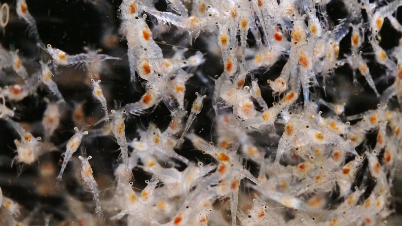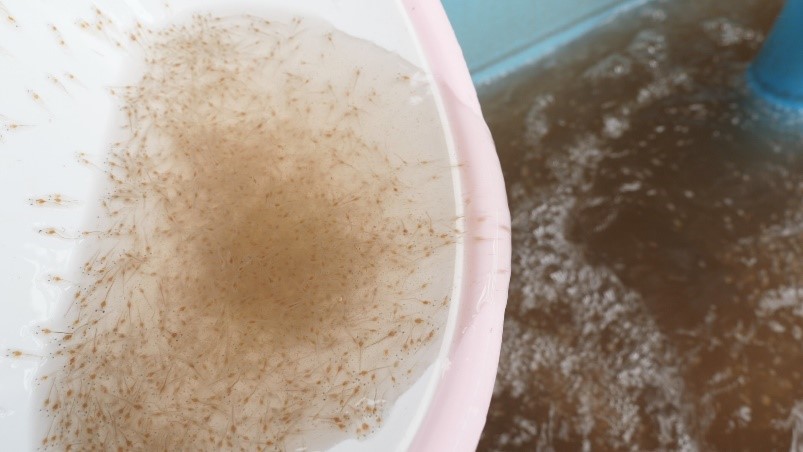 The ideal size for releasing shrimp larvae is PL12 (6 mm or more), as they can find feed faster, present in a feeding tray faster, and grow faster than smaller shrimp. Additionally, these shrimp are strong enough to escape from predators, resulting in a higher survival rate. Before releasing the shrimp, acclimate them by placing a sample in the pond water for at least 24 hours to ensure they can adapt to the new environment and confirm that no harmful chemicals are present.